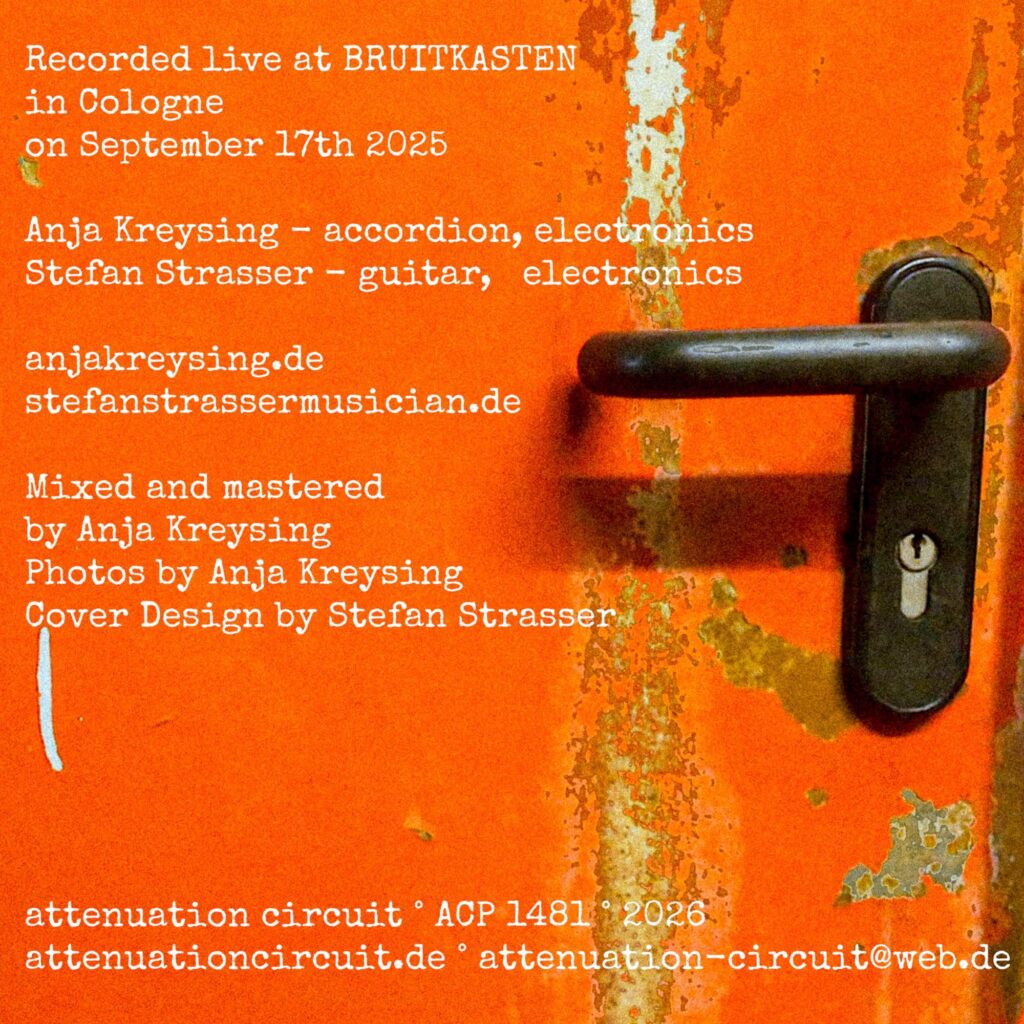 Anja Kreysing (accordion & electronics) and Stefan Strasser (guitar & electronics) navigate dense sonic geographies of abstract texture and harmonic traces, where signals erode, tonal fragments emerge and disappear, and noise moves like weather across concrete structures.
