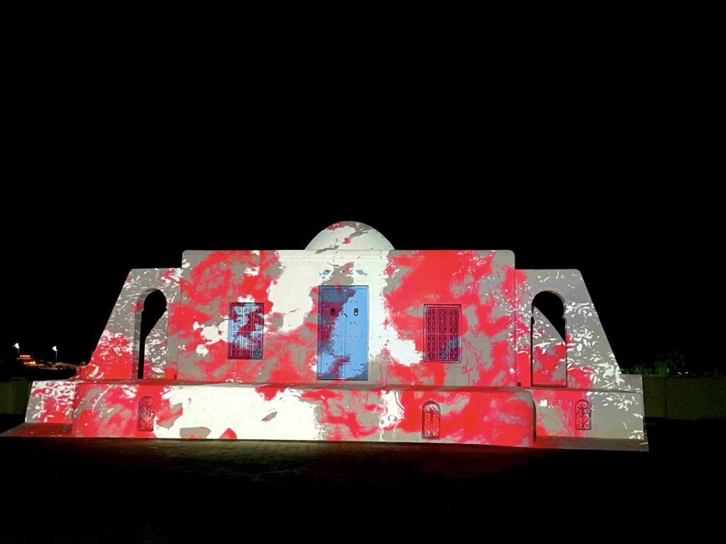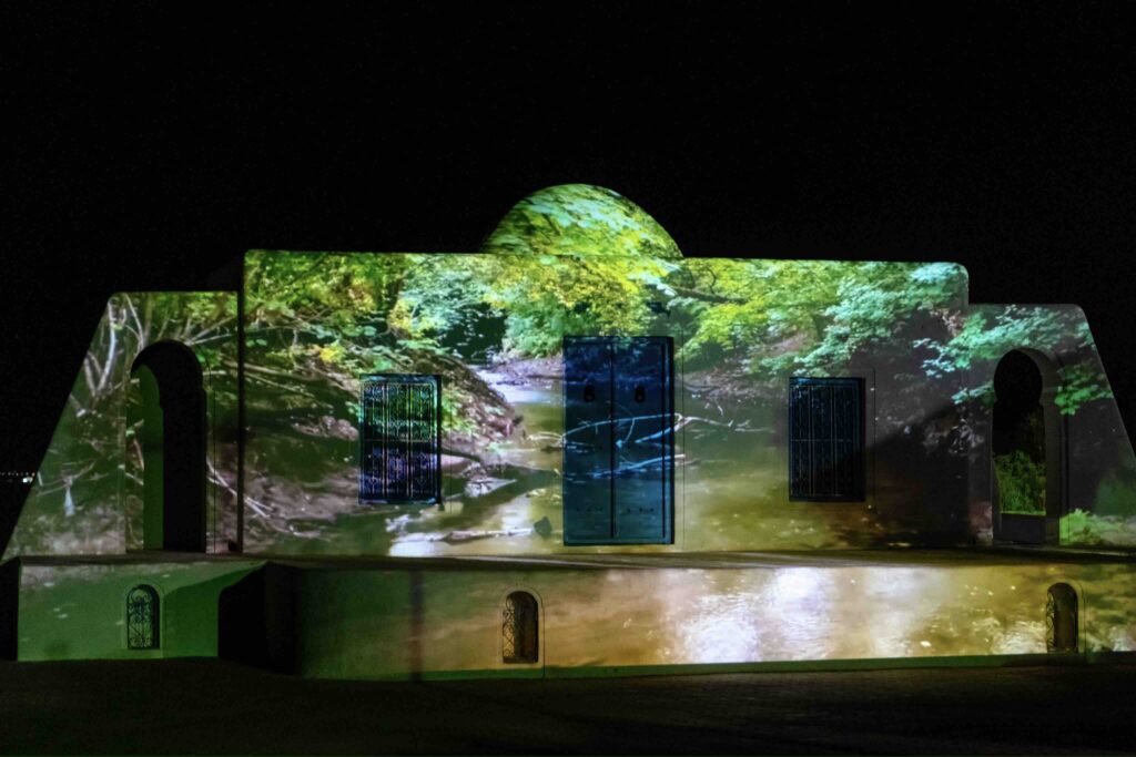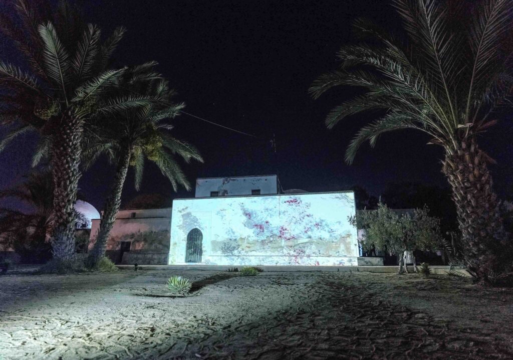 „ANGEL converts the old facade of the mausoleum of Sidi El Zitouni at the Traditional Heritage Museum Djerba into a projection surface, while transforming the palm garden in front of it into a performative resonance space. With its light and sound staging, it actively intervenes in the architectural and landscape situation, creating a hybrid place between historical architecture, public space and artistic experiment.